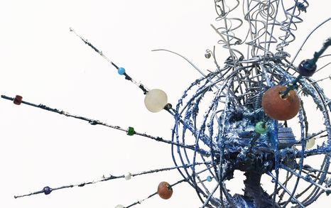 This art piece shows the creation of atoms and the preliminary birth of a human from a supernova. A bicycle wheel bent in to a sphere represents a star at the moment of its explosion. The glass beads are atoms, that are being spewed from the sides of the supernova. A figure resembling a human is made out of wire. Inside his body are numerous galaxies. He shouts out from the center of the star, up into the Cosmos.